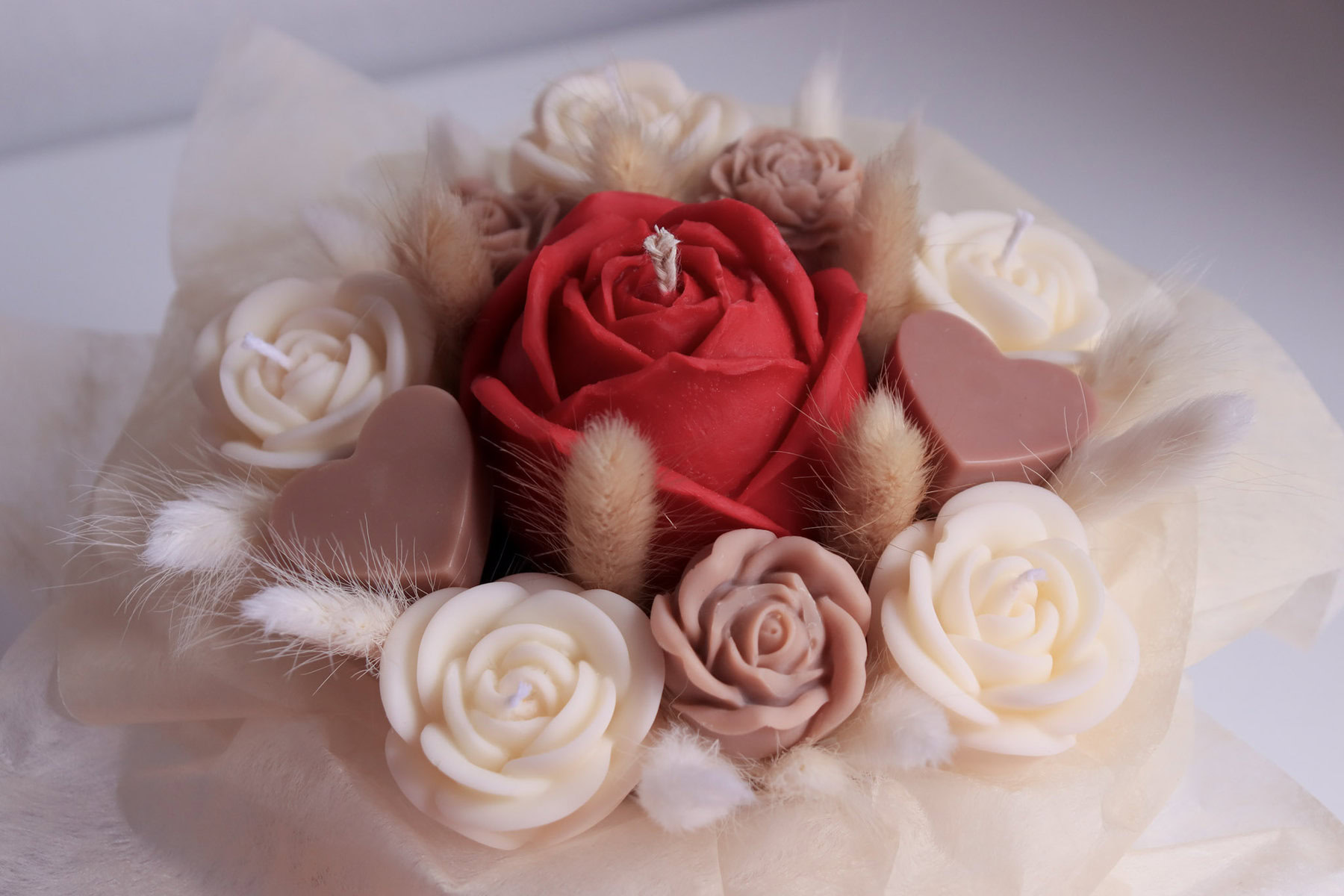 - Svaki buket je unikatan i nemoguće je napraviti dva identična buketa. Stoga postoji vjerojatnost male razlike u nijansama boja i slaganju svijeća u odnosu na fotografije.