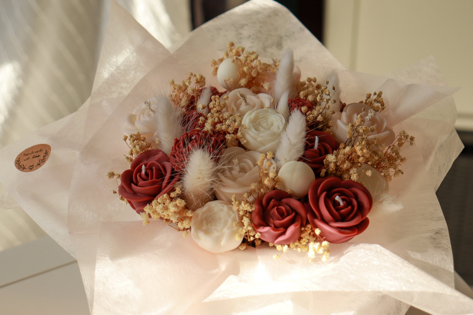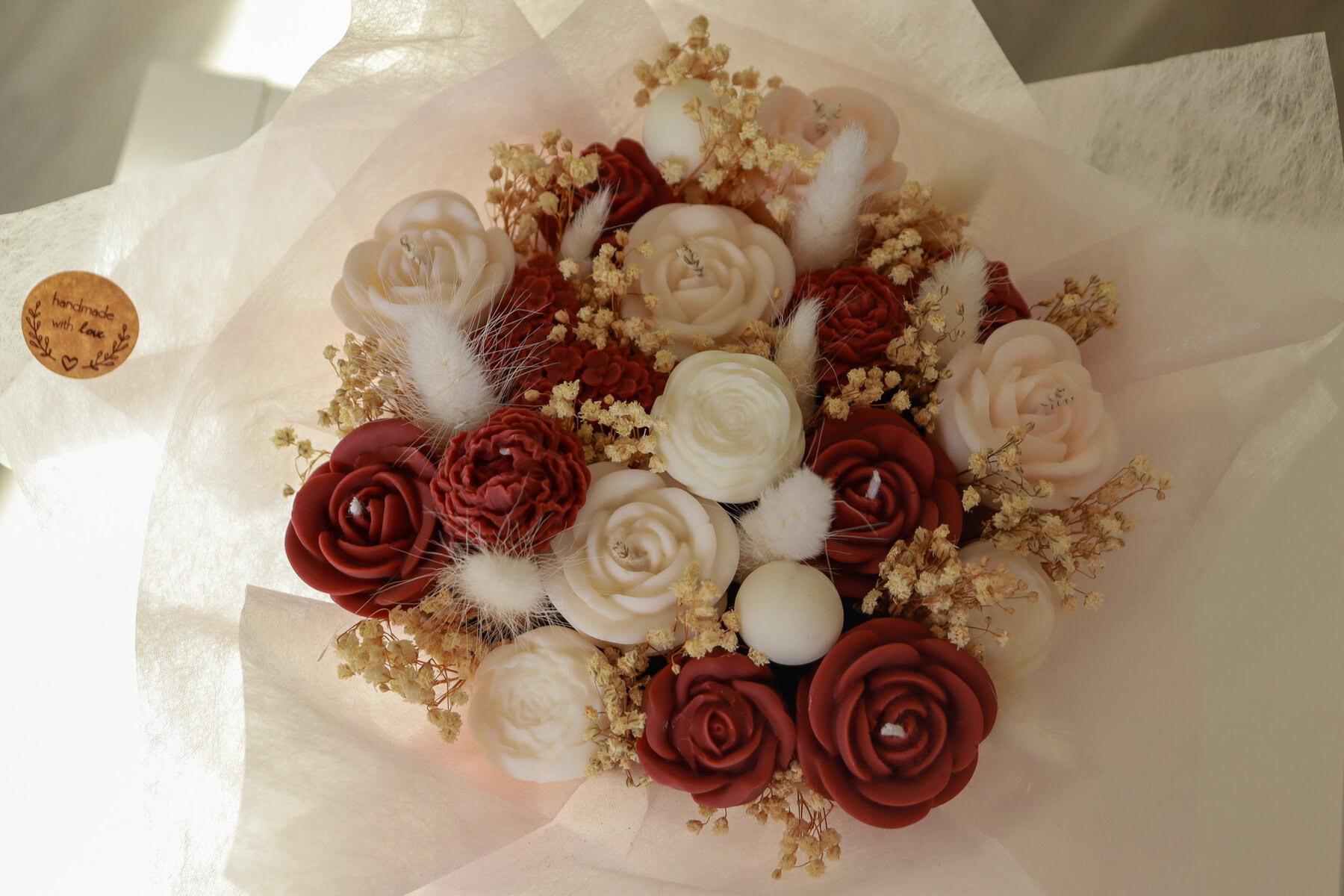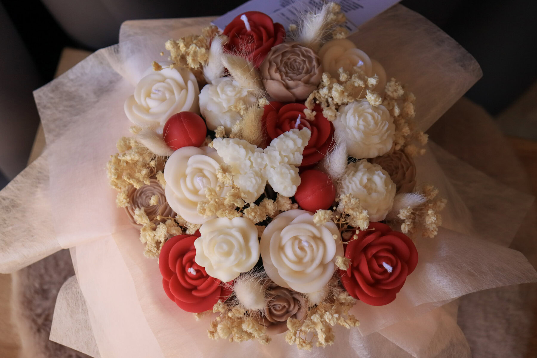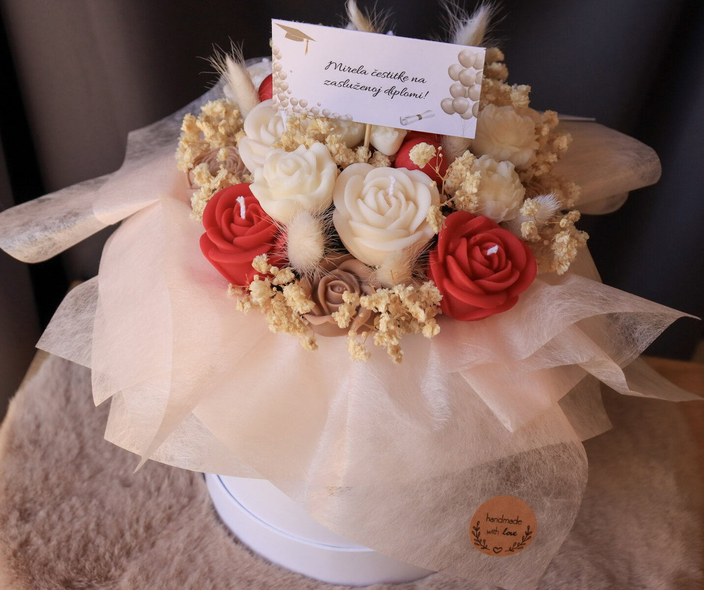 - Svaki buket je unikatan i nemoguće je napraviti dva identična buketa. Stoga postoji vjerojatnost male razlike u nijansama boja i slaganju svijeća u odnosu na fotografije.