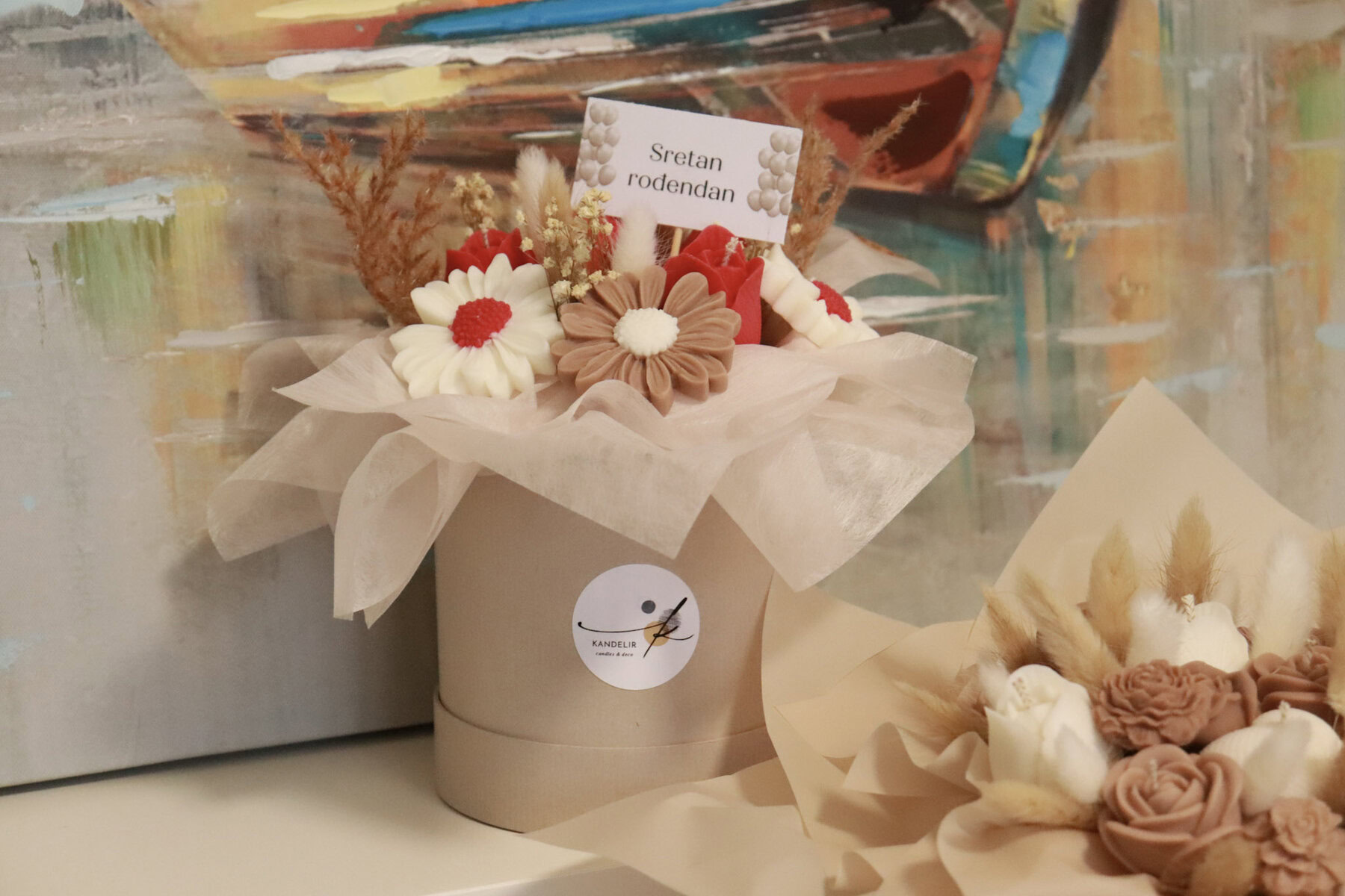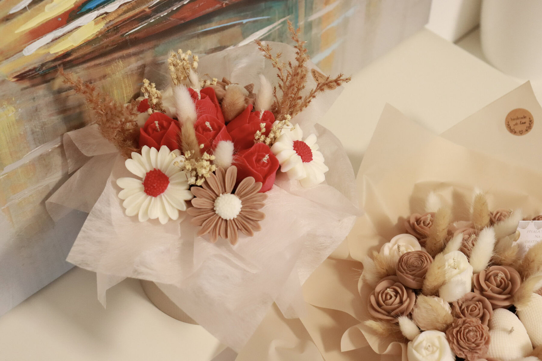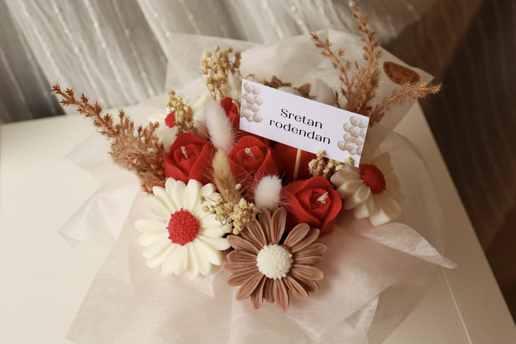 • Svaki buket je unikatan i nemoguće je napraviti dva identična buketa. Stoga postoji vjerojatnost male razlike u nijansama boja i slaganju svijeća u odnosu na fotografije.