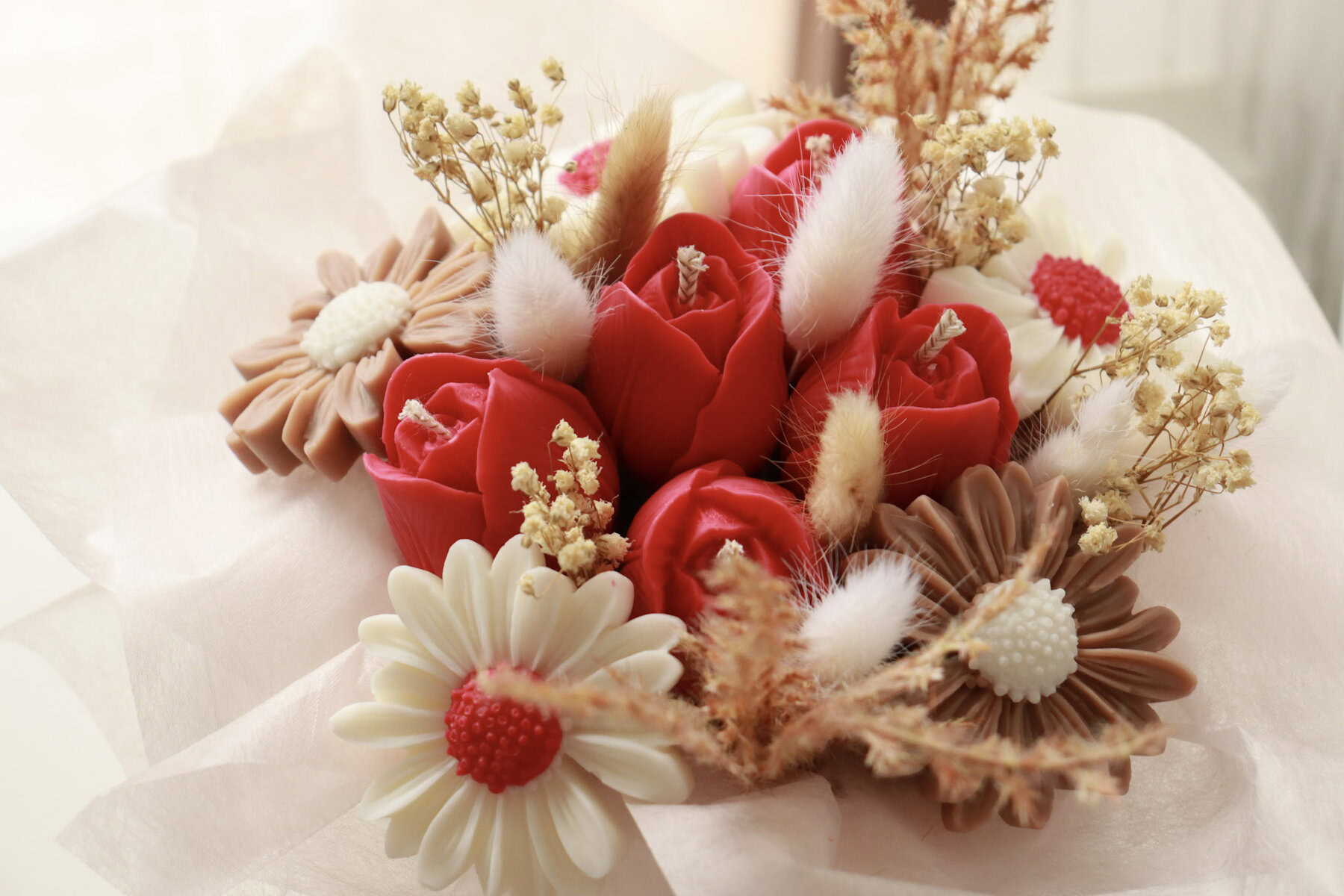 Rouge Bloom je mali, ali izrazito upečatljiv buket od svijeća izrađen od 100% suncokretovog voska EU porijekla. U S veličini donosi savršenu ravnotežu elegancije i topline – raskošni crveni tulipani u kombinaciji s nježnim cvjetovima u krem i cappuccino tonovima stvaraju profinjenu, romantičnu kompoziciju.