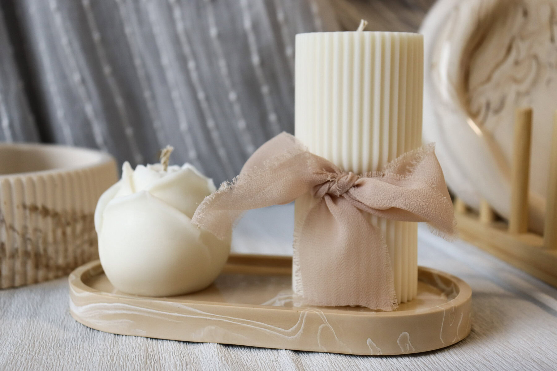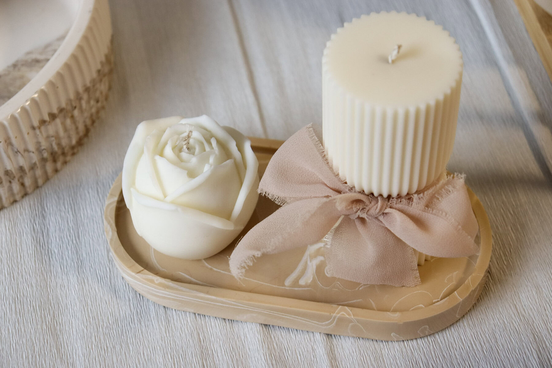 Paket se sastoji od dekorativnog pladnja izrađenog od Jesmonite materijala, pilar svijeće s elegantnim vertikalnim linijama te dodatne svijeće u obliku ruže ili oblaka, ovisno o odabranoj varijanti. Sve komponente međusobno su vizualno usklađene i stvaraju nježan, minimalistički dojam.