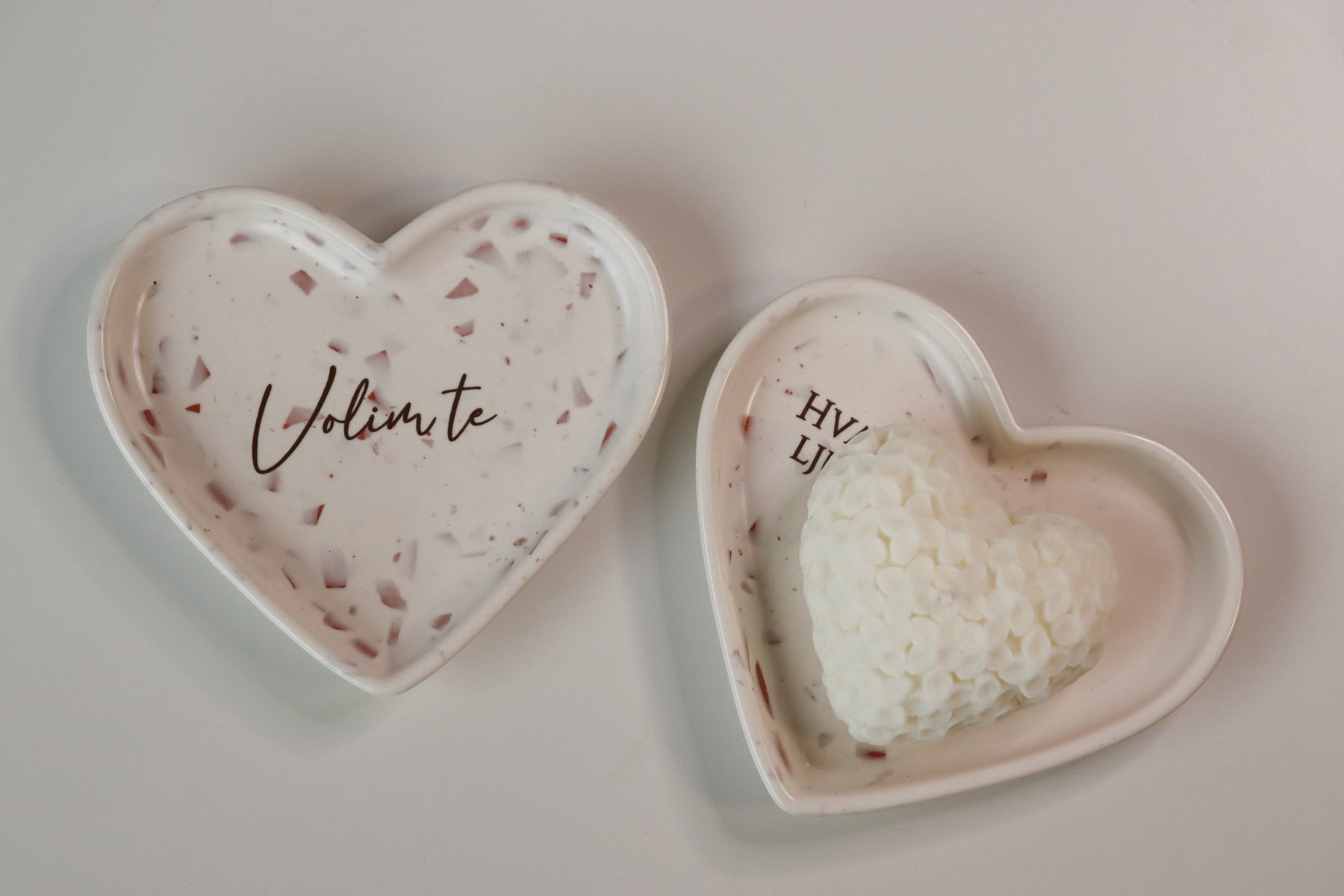 Terrazzo pladanj od čvrstog ekološkog materijala Jesmonite moguće je personalizirati natpisom po želji, čime set postaje jedinstven i osoban poklon – idealan za Valentinovo, godišnjice, vjenčanja, rođendane ili kao znak pažnje dragoj osobi.