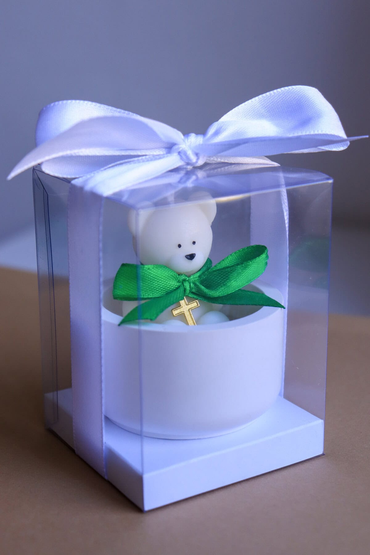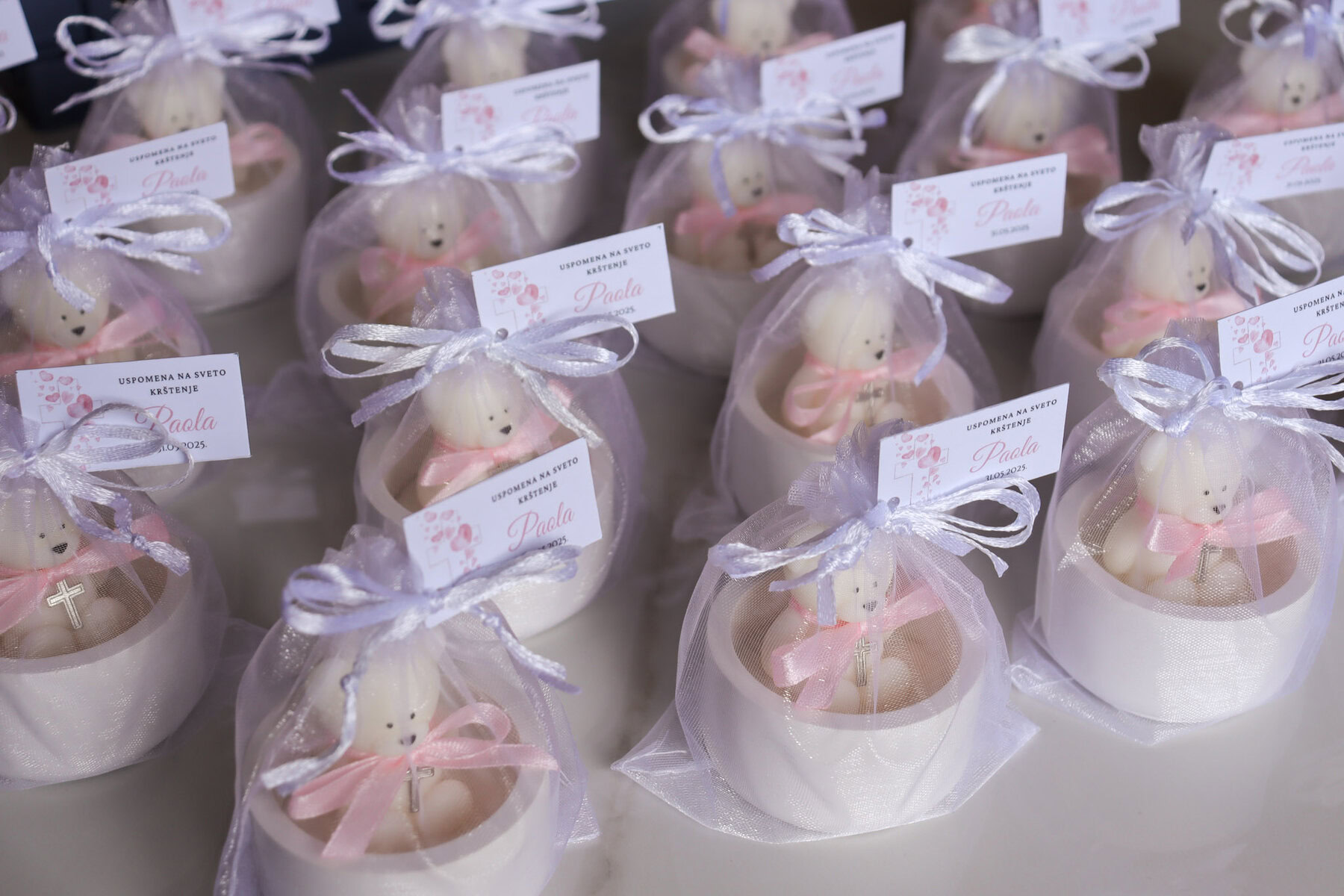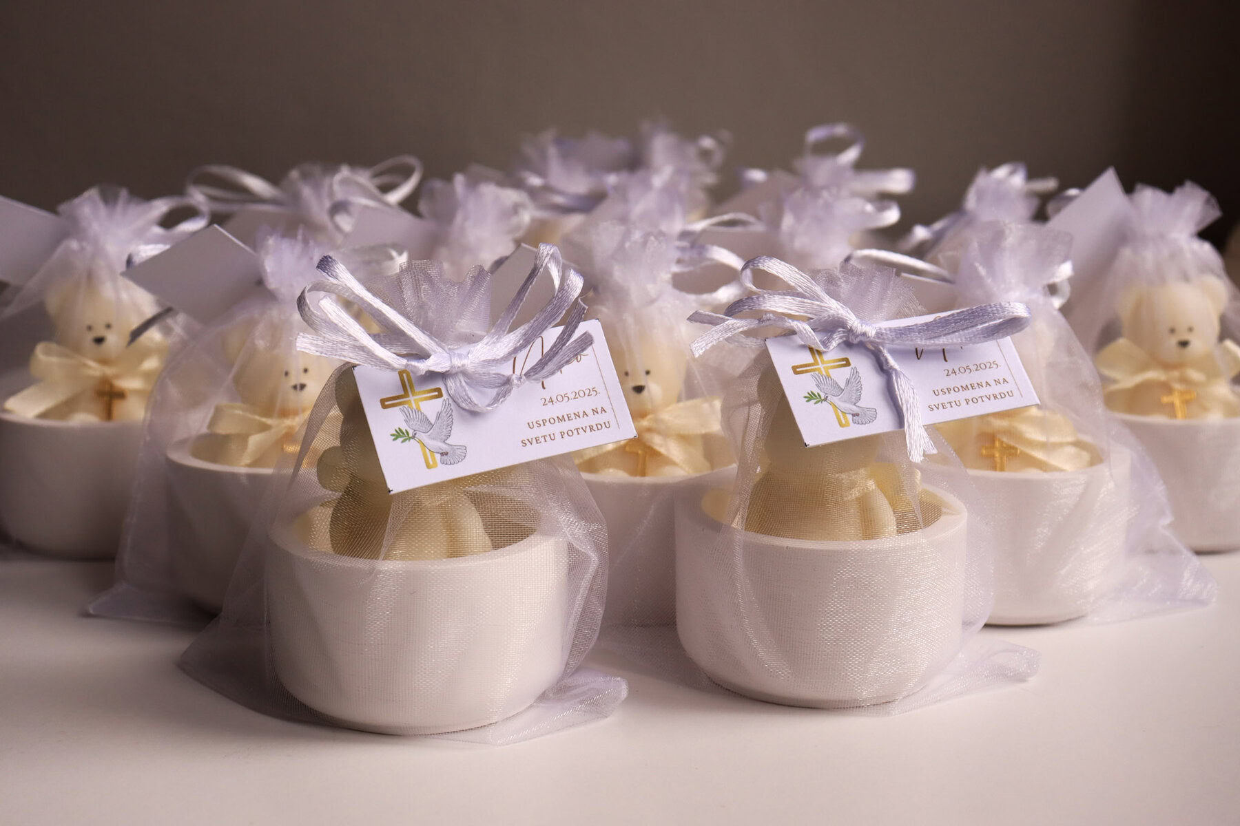 Unikatni medvjedići izrađeni od prirodnog sojinog voska smješteni su u ručno rađene posudice od gipsa, stvarajući nježan i elegantan suvenir koji će očarati svakog gosta. Svaki medvjedić dolazi ukrašen satenskom mašnicom i malenim križićem (po izboru), a pakiran je u prozračnu organza vrećicu s personaliziranom karticom.