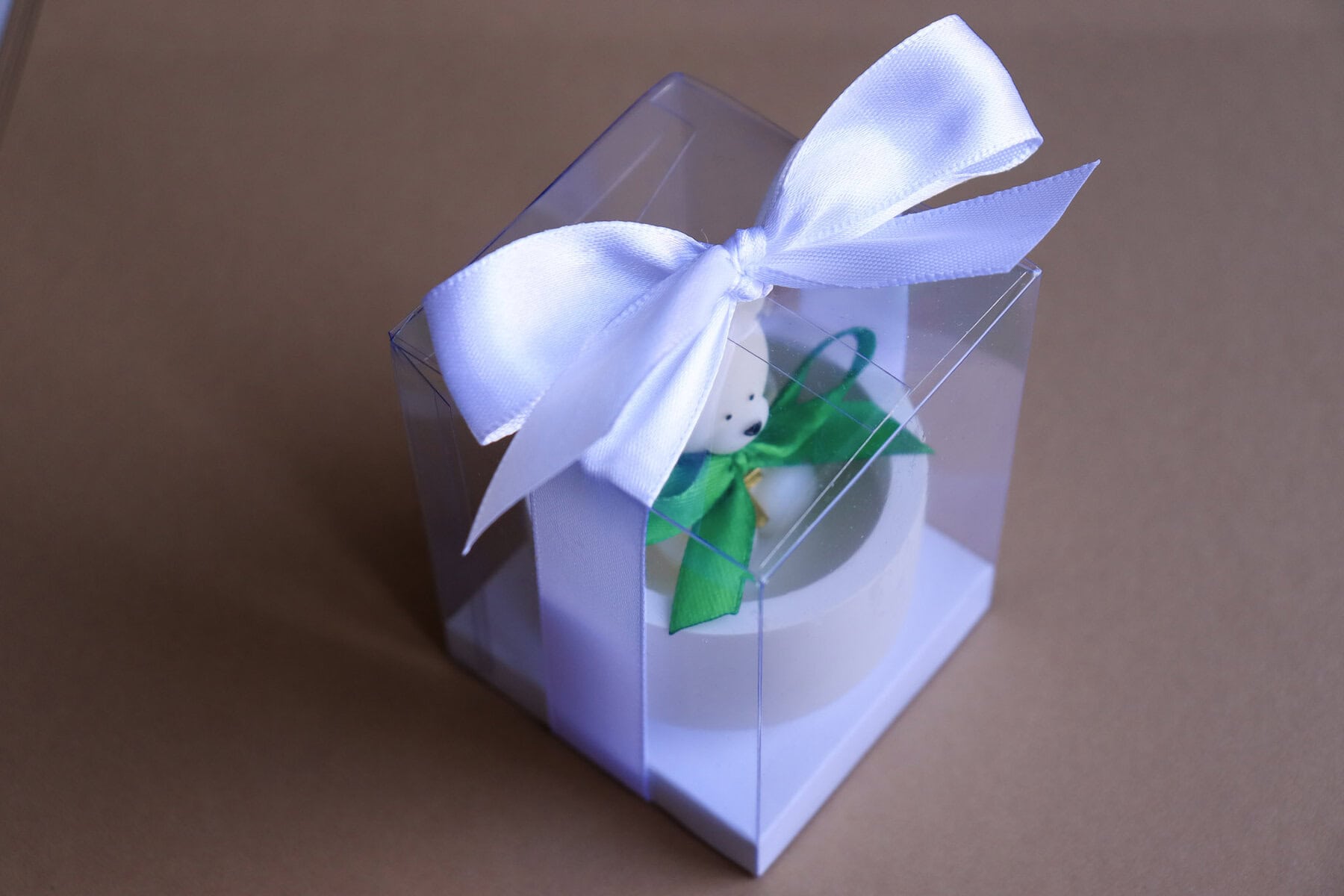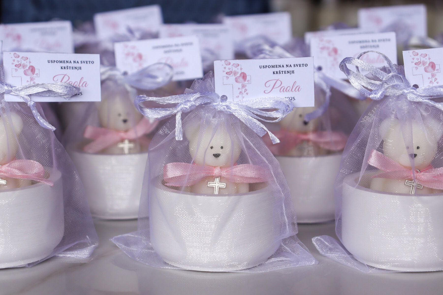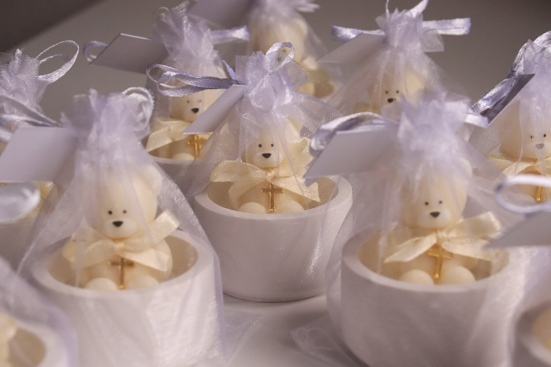 Unikatni medvjedići izrađeni od prirodnog sojinog voska smješteni su u ručno rađene posudice od gipsa, stvarajući nježan i elegantan suvenir koji će očarati svakog gosta. Svaki medvjedić dolazi ukrašen satenskom mašnicom i malenim križićem (po izboru), a pakiran je u prozračnu organza vrećicu s personaliziranom karticom.